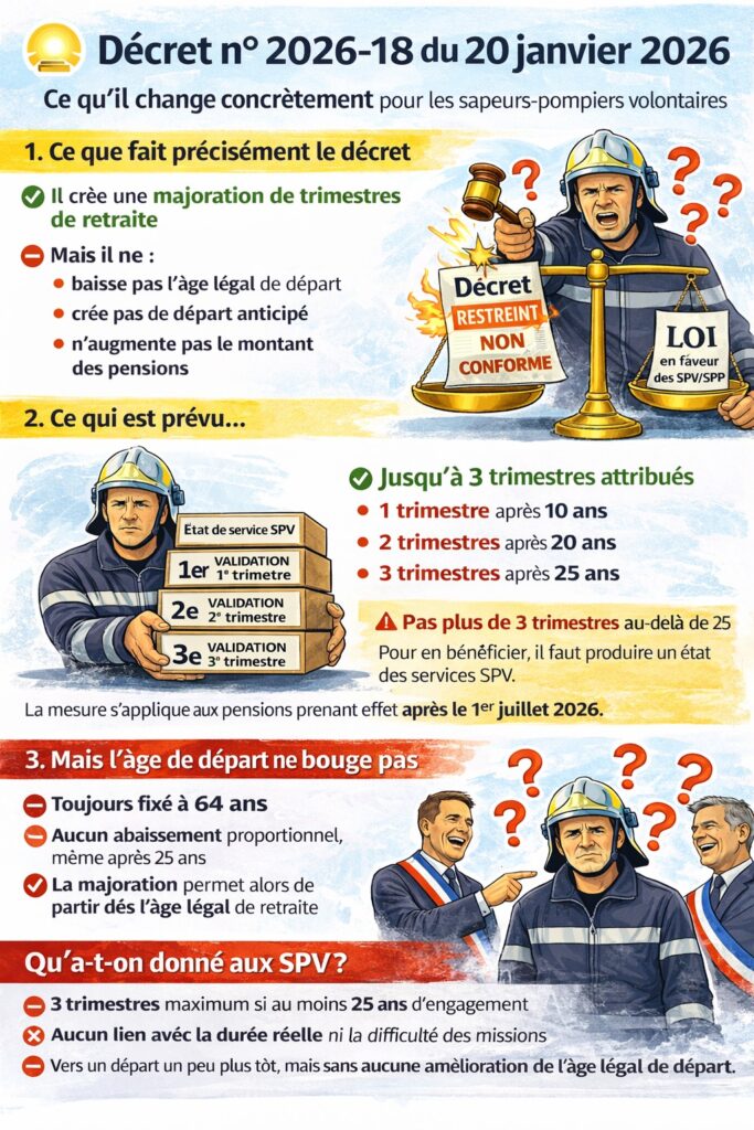 La loi ouvre droit à des trimestres supplémentaires dès dix années de service comme sapeur-pompier volontaire. Le décret d’application limite pourtant cette bonification à un seul trimestre pour dix ans, ce qui apparait restrictif et contraire à la lettre et à l’esprit de la loi.